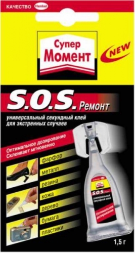 Супер Момент «S.O.S. Ремонт» Характеристики изделия / применение: Клей идеально подходит для склеивания фарфора, керамики, дерева, кожи, резины, большинства пластиков, металла, пробки. Не пригоден для полиэтилена, полипропилена, тефлона и стиропора. Состав: Этилцианакрилат. Основные свойства: - cклеивает мгновенно, позволяет производить ремонт за считанные секунды; - жидкий, заполняет мельчайшие трещины; - оптимальное дозирование, экономичный расход; - прозрачная пластикокая туба удобна в использовании и хранении; - многократное использование; - уникальный герметичный колпачок обеспечивает сохранность 18 месяцев. Упаковка: 1,5 г, лента 6 шт. по 1,5 г Срок годности: 18 месяцев Страна производитель: Бразилия Указания по применению: Поверните колпачок, чтобы сорвать предохранительные перемычки. Нанесите клей тонким ровным слоем на одну из склеиваемых поверхностей. Сразу же сильно прижмите склеиваемые поверхности друг к другу на 5-60 секунд. Поверните колпачок и наденьте на носик тюбика. Надавите на колпачок до щелчка. Меры предосторожности: Осторожно! Цианакрилат! Склеивает мгновенно. Пары клея не вдыхать! Работы проводить в хорошо проветриваемом помещении. Беречь от детей! В случае попадания на кожу промыть теплой водой с мылом. При попадании клея в глаза немедленно промойте глаза водой и при необходимости обратитесь к врачу.